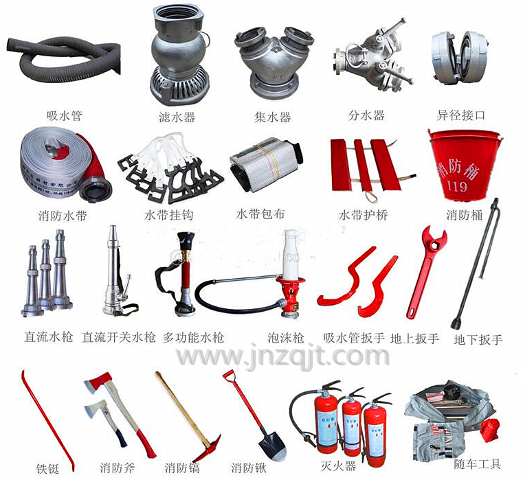 一般消防车在出厂的时候配置有常用的消防器材,主要分为灭火类、救生类和抢险类等。具体配备器材配备表为确,这些器材都是在消防车使用过程中要用到的。 启到非常大的作用。 下面对湖北江南消防车厂家消防车器材的作用--分解一下! 吸水管:用于连接水泵进水口向水源吸水,置于车厢顶部。 滤水器:它装在吸水管的另一端,向露天水源吸水时,可防止进水管路被杂物堵塞。当水泵临时停止运转时,由于滤水器中单向阀的作用,吸水管内存水不会泄出,重新启动泵时会很快上水。 吸水管同行接口:使用消防栓时,用来连接水泵与消防栓。同常置放在器材室内。 分水器:是将80mm口径的水带主干线分为三条65mm口径的支线连接装置,每个出水口有球阀控制,各出口可同时使用亦可分别使用。日常置放在器材室内。 集水器:当消防车的外接水源用水带接口时,可先将集水器安装在水泵进水口上,利用其另外2个65mm接口与水带连接,另一端接供水源接口处,常用于消防车之间大接力或连接lOOmm出水口的消防栓。同常置放在器材室内。 异径接口:用于连接车上出水阀和中压水带及低压水带80mm和65mm口径之间的转换。同常置放在器材室内。 水带包柿:在灭火过程中,出现水带局部破裂漏水时,可用水带包柿裹紧水带漏水处,以防裂口继续扩大,减少水量流失。日常置放在器材室器材盒内。 水带挂钩:用以将水带悬挂在梯蹬上,协助蹬梯消防员控制水带。 中压水带:在远距离和高层灭火,及需提高水压时,应在中压出水管出水阀上先接上中压水带,在通过过渡水带(两端接口不同或中低压转换接口)接普通低压水带。 泡沫连接软管:当车上泡沫罐内泡沫使用完后可利用外接泡沫型式,一端接泡沫比例混合器外接口,一端插入装有泡沫的容器内。 泡沫枪泡沫吸管:当不使用泡沫比例混合武器时,可一端接空气泡沫枪上一端插入泡沫容器内。 |
