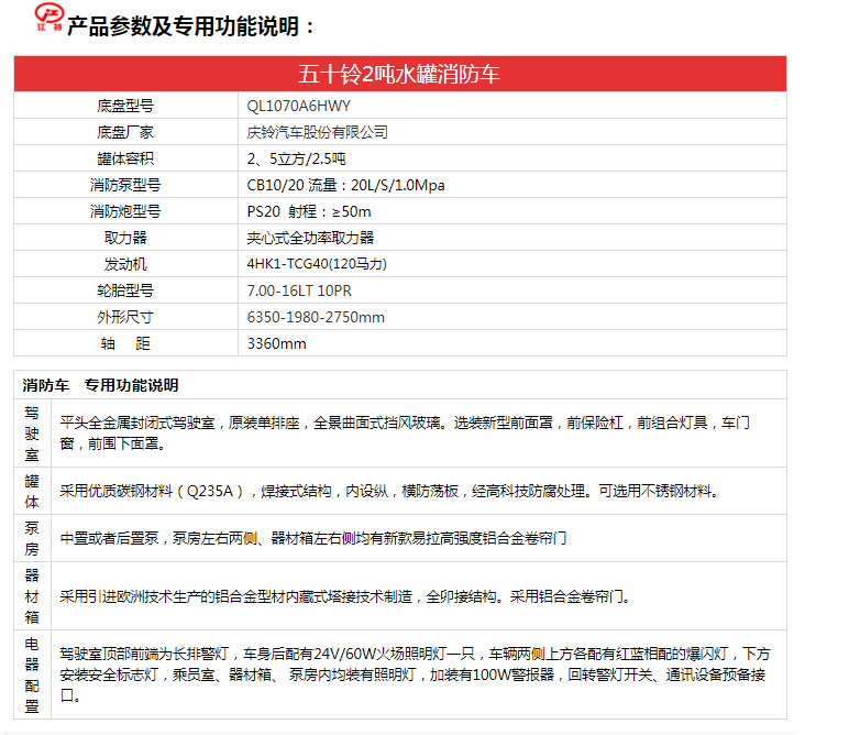 随着国六排放逐渐实施、湖北江南消防车厂家新款上市五十玲2吨水灌消防车、下面为大家介绍该车车型技术说明!国六五十玲100P水灌消防车、全方位图片展示! 国六五十玲水灌消防车图片+技术+配置、整车配置齐全、价格合理、需要技术参数请点击http://www.tbxgczu.cn/
